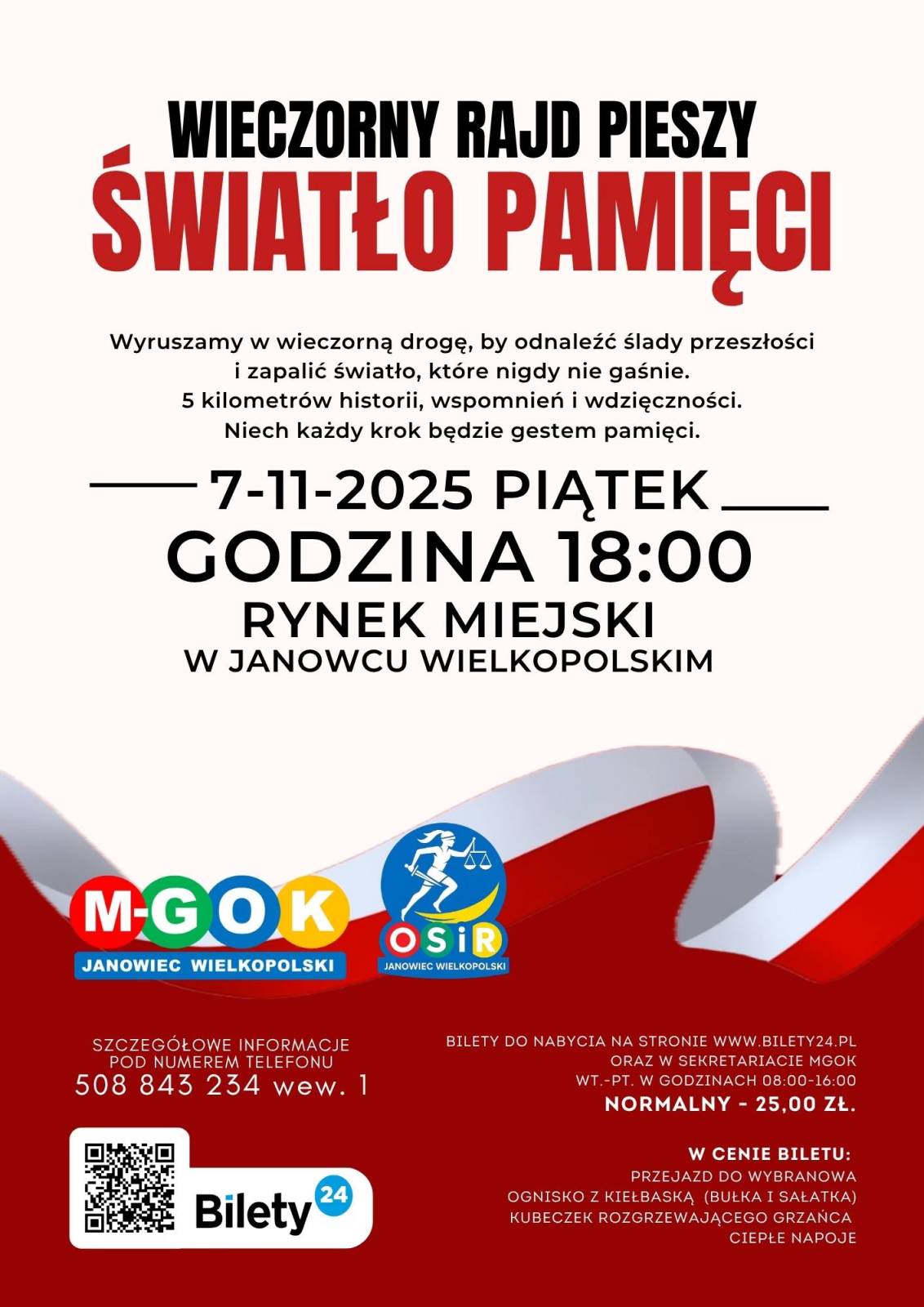 Miejsko-Gminny Ośrodek Kultury w Janowcu Wlkp. wraz z Ośrodkiem Sportu i Rekreacji w Janowcu Wlkp. serdecznie zapraszają na wieczorny rajd pieszy "Światło Pamięci" organizowany dnia 7 listopada z okazji Narodowego Święta Niepodległości.