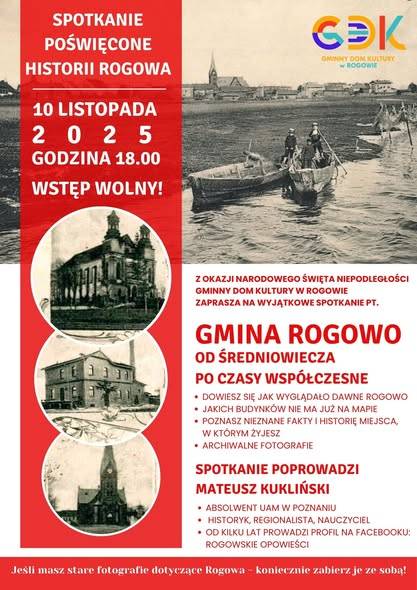 Gminny Dom Kultury w Rogowie serdecnie zaprasza na spotkanie pt. ,,Gmina Rogowo od średniowiecza po czasy wspołczesne", które odbędzie się 10 listopada o godz. 18:00.