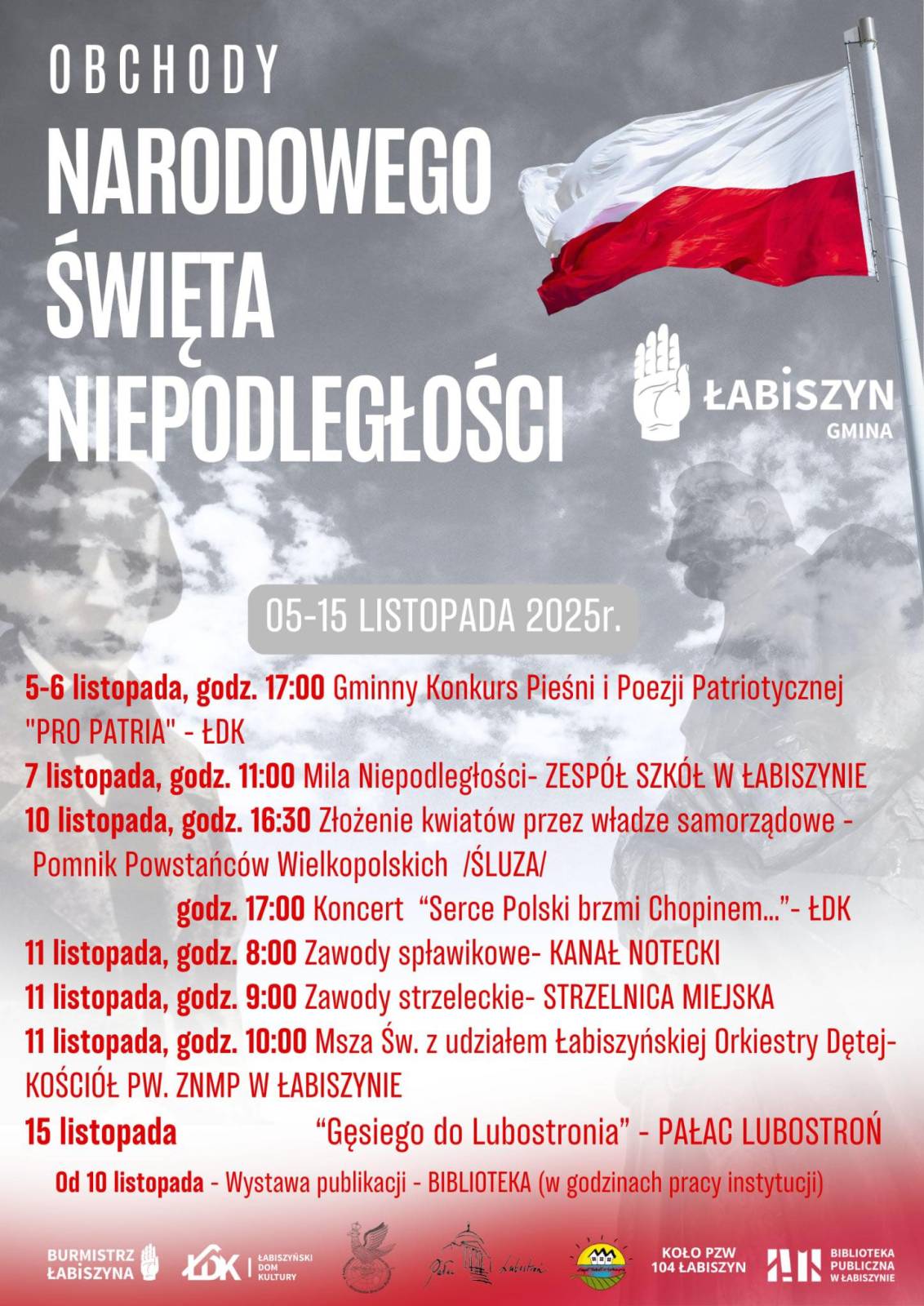 Serdecznie zapraszamy na obchody Narodowego Święta Niepodległości w Gminie Łabiszyn, gdzie czekają na państwa wydarzenia artystyczne, muzyczne, sportowe i patriotyczne.