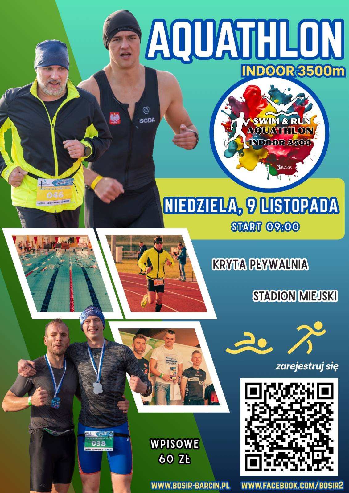 Serdecznie zapraszamy dnia 9 listopada o godzinie 9:00 na Aquathlon Indoor 3500 m, czyli najfajniejsze połączenie basenu i bieżni, jakie można sobie wyobrazić.