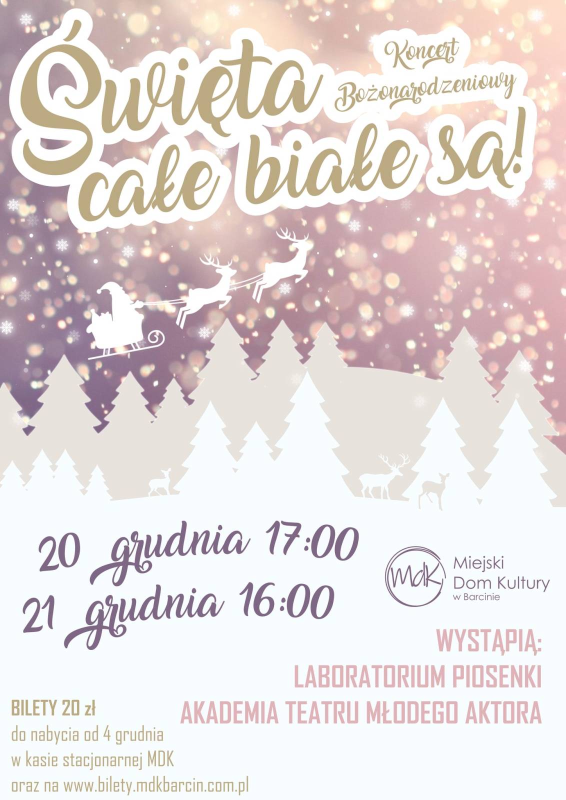 Miejski Dom Kultury w Barcinie serdecznie zaprasza dnia 20 i 21 grudnia na Koncert Bożonarodzeniowy pt. „Święta całe białe są”, w wykonaniu sekcji działających w Miejskim Domu Kultury.