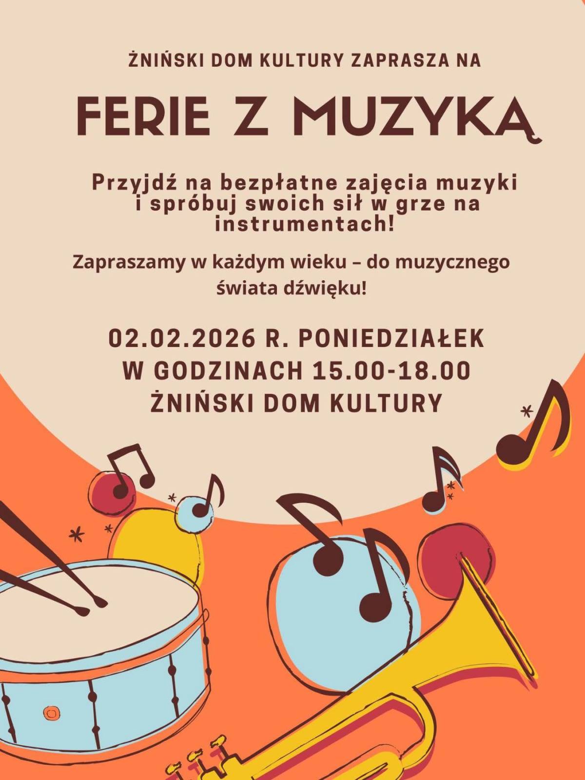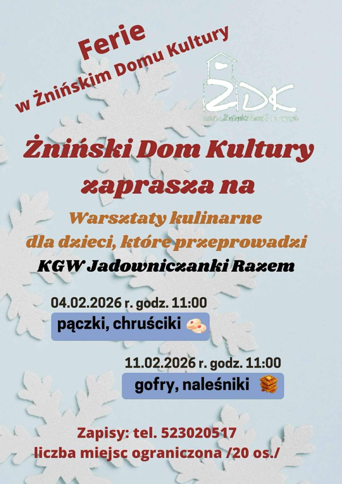 Żniński Dom Kultury serdecznie zaprasza wszystkie dzieci do aktywnego spędzenia ferii zimowych.