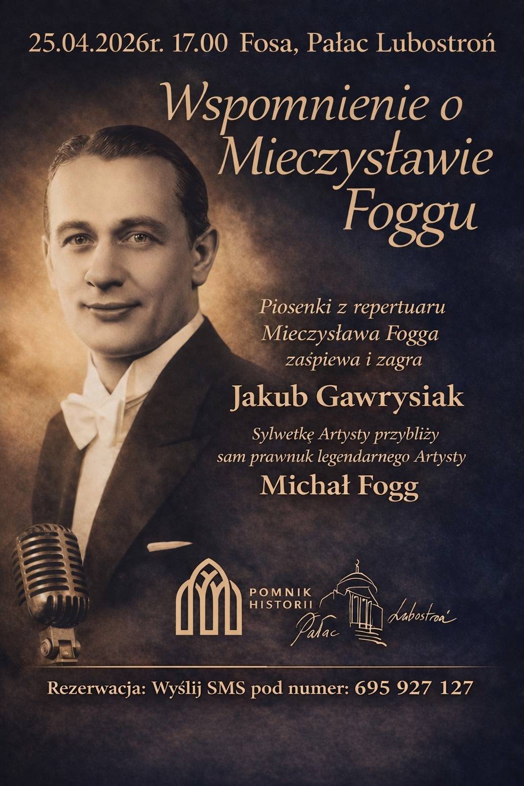 Serdecznie zapraszamy na wyjątkowy koncert „Wspomnienie o Mieczysławie Foggu”, który odbędzie się 25 kwietnia 2026 roku o godzinie 17:00 w Fosie Pałacu Lubostroń.