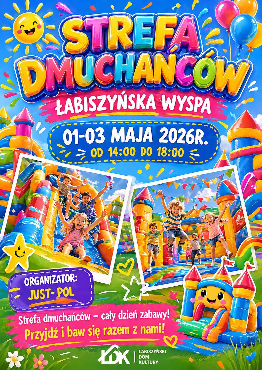 Serdecznie zapraszamy do Strefy Dmuchańców, która będzie dostępna w dniach 1–3 maja na Łabiszyńskiej Wyspie w Łabiszyn.